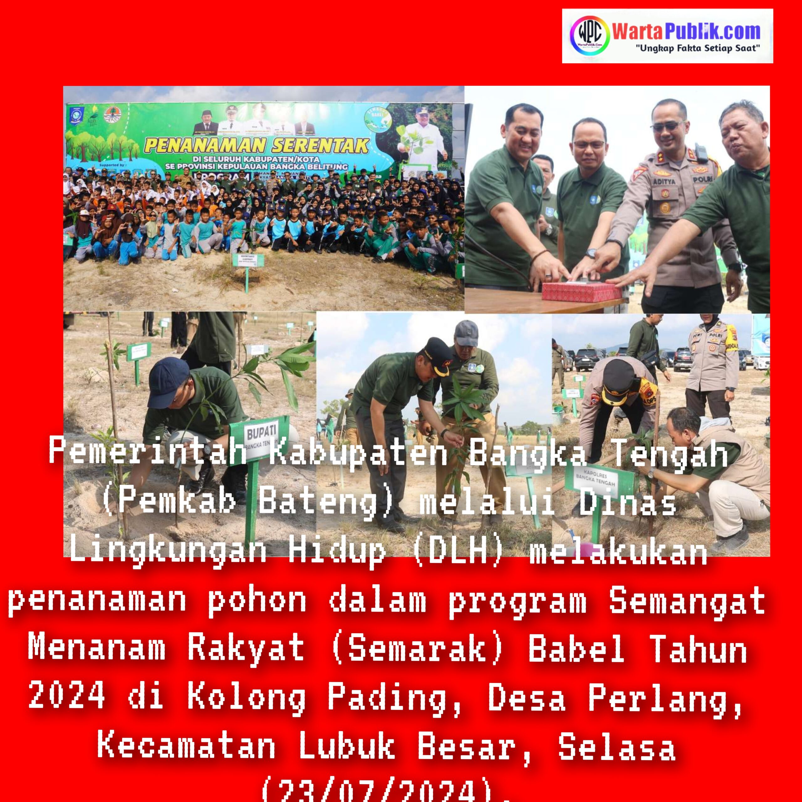 WARTAPUBLIK.COM,Lubuk Besar – Pemerintah Kabupaten Bangka Tengah (Pemkab Bateng) melalui Dinas Lingkungan Hidup (DLH) melakukan penanaman pohon dalam program Semangat Menanam Rakyat (Semarak) Babel Tahun 2024 di Kolong Pading, Desa Perlang, Kecamatan Lubuk Besar, Selasa (23/07/2024).