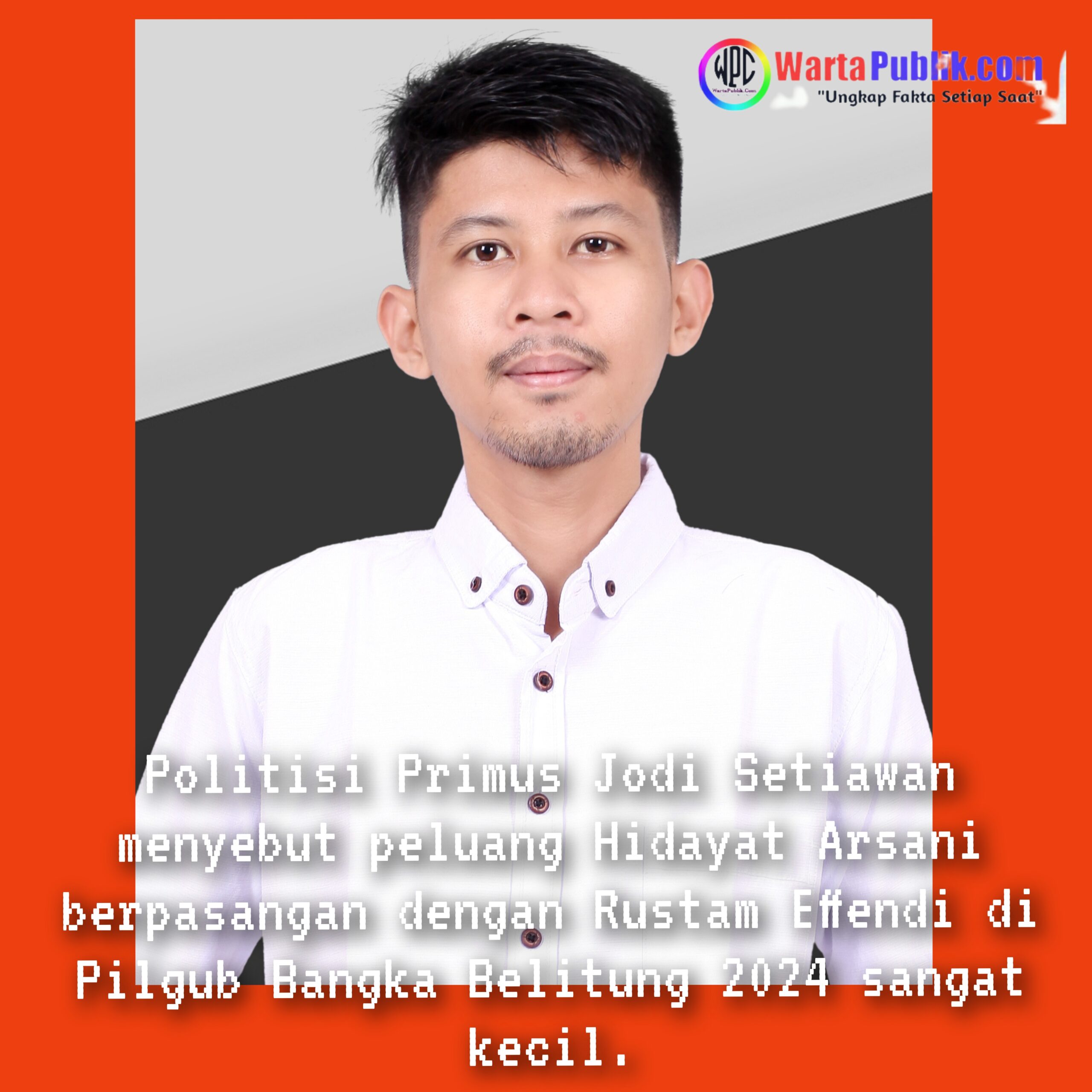 WARTAPUBLIK.COM, Bangka Belitung — Politisi Primus Jodi Setiawan menyebut peluang Hidayat Arsani berpasangan dengan Rustam Effendi di Pilgub Bangka Belitung 2024 sangat kecil.