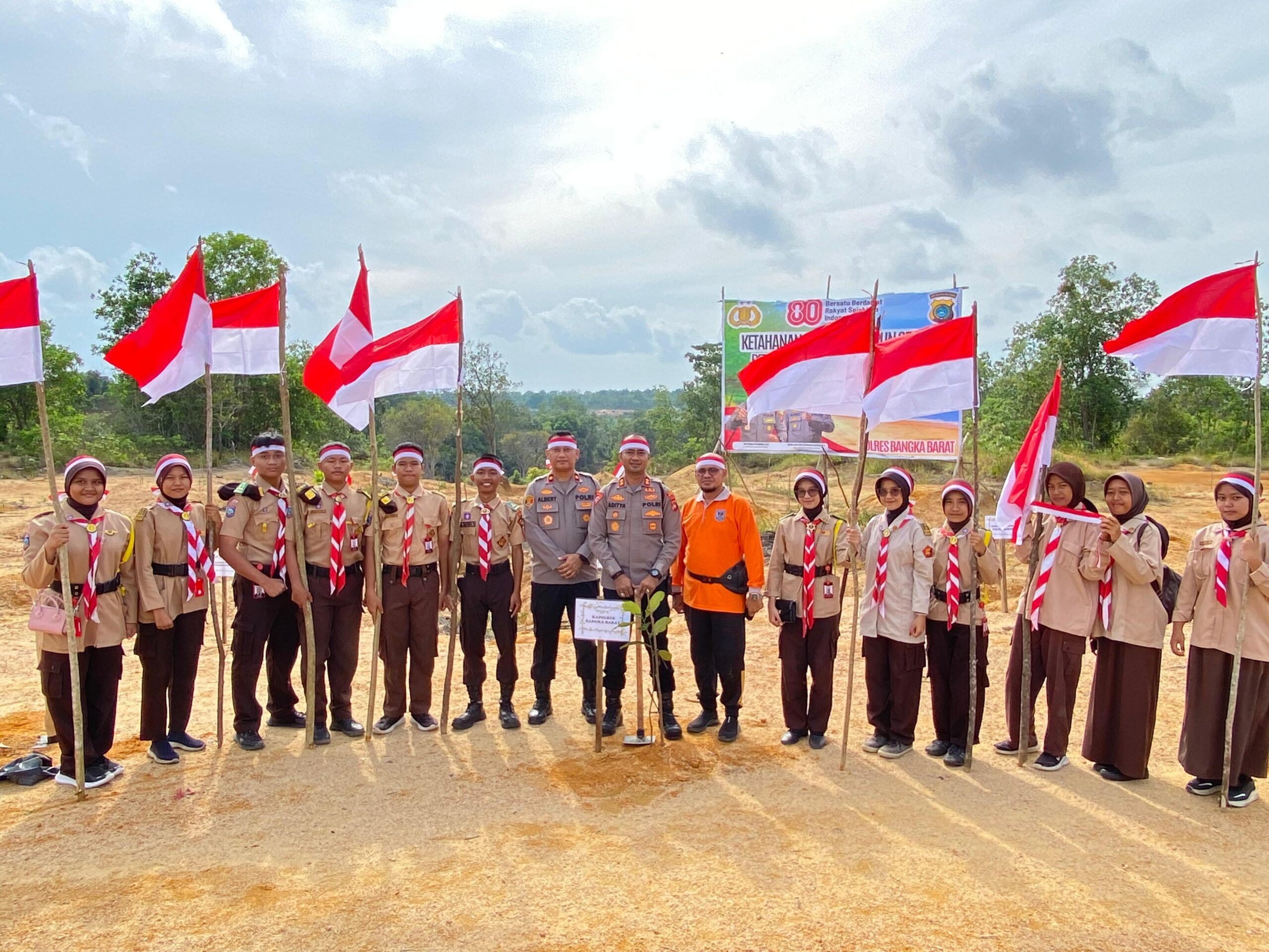 MENTOK — Dalam rangka memperingati HUT ke-80 Kemerdekaan Republik Indonesia, Polres Bangka Barat menggelar kegiatan Ketahanan Bumi Serumpun Sebalai dengan menanam 500 bibit pohon di lahan bekas tambang seluas dua hektar di Dusun Pait Jaya, Desa Belo Laut, Kecamatan Mentok, Jumat (15/8/2025).