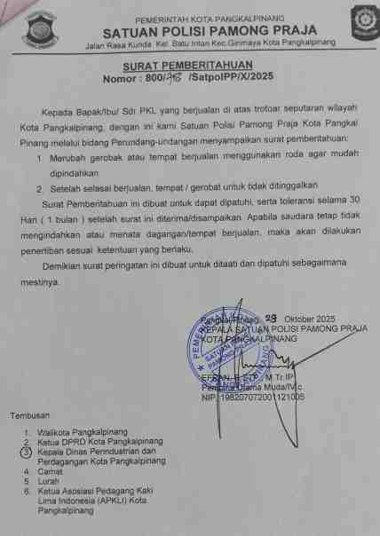 Wartapublik.com, Pangkalpinang — Satuan Polisi Pamong Praja (Satpol PP) Kota Pangkalpinang menerbitkan Surat Pemberitahuan Nomor 800/718/SatpolPP/X/2025 yang mengatur keberadaan pedagang kaki lima (PKL) di kawasan trotoar.