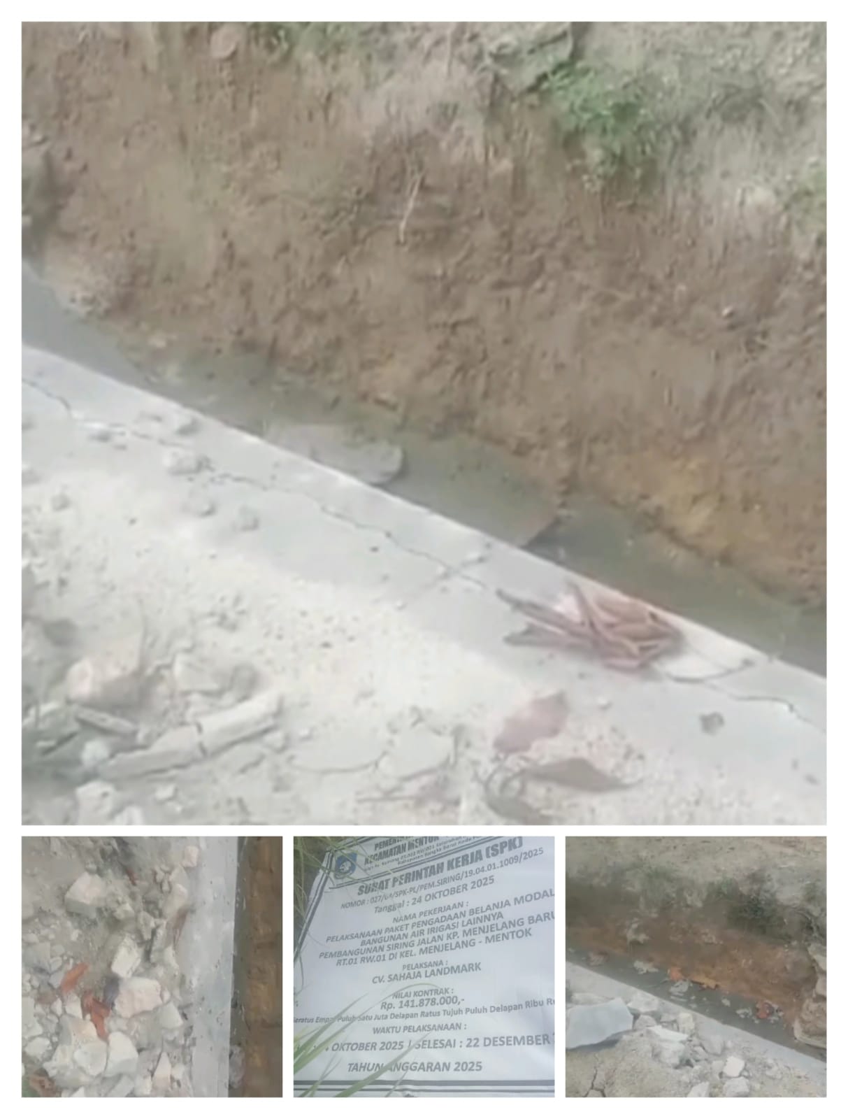 Pasalnya, proyek drainase yang bersumber dari APBD 2025 dengan nilai anggaran Rp141.878.000 itu diduga mengalami kegagalan konstruksi.