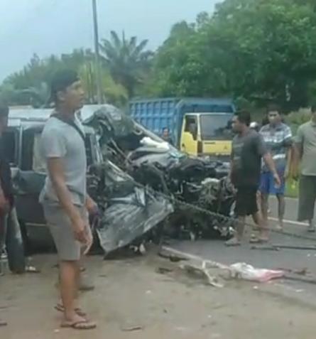 Mobil tersebut keluar jalur dan menghantam bagian depan truk yang datang dari arah berlawanan. Benturan keras membuat minibus terseret beberapa meter hingga berhenti di bahu jalan dalam kondisi rusak parah.