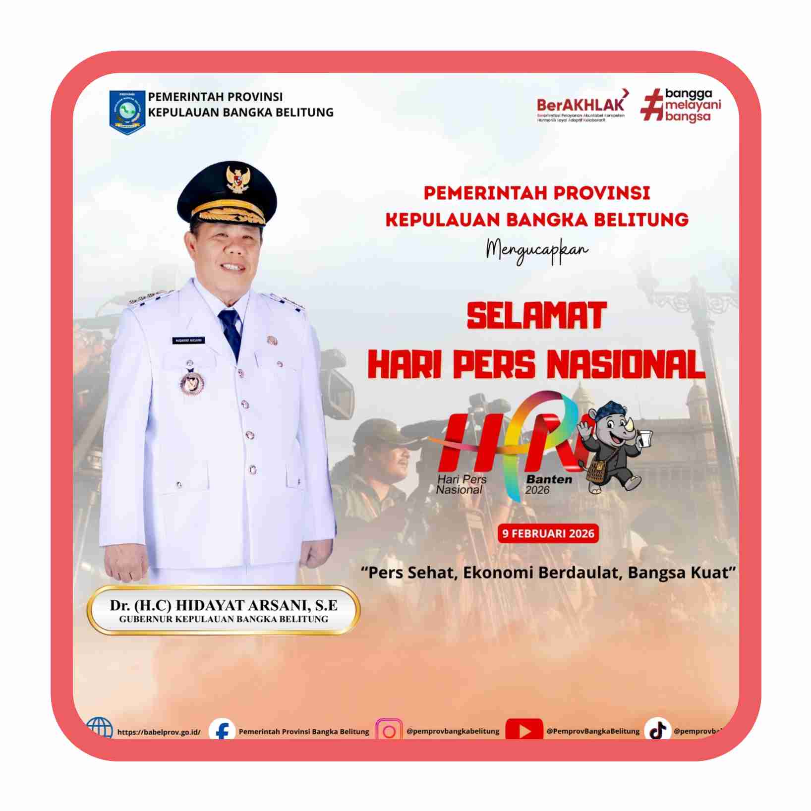 Pada momentum HPN 2026 ini, Gubernur Hidayat juga menyampaikan ucapan selamat kepada seluruh jurnalis di Indonesia, khususnya insan pers di Kepulauan Bangka Belitung yang selama ini menjadi mitra strategis pemerintah daerah.